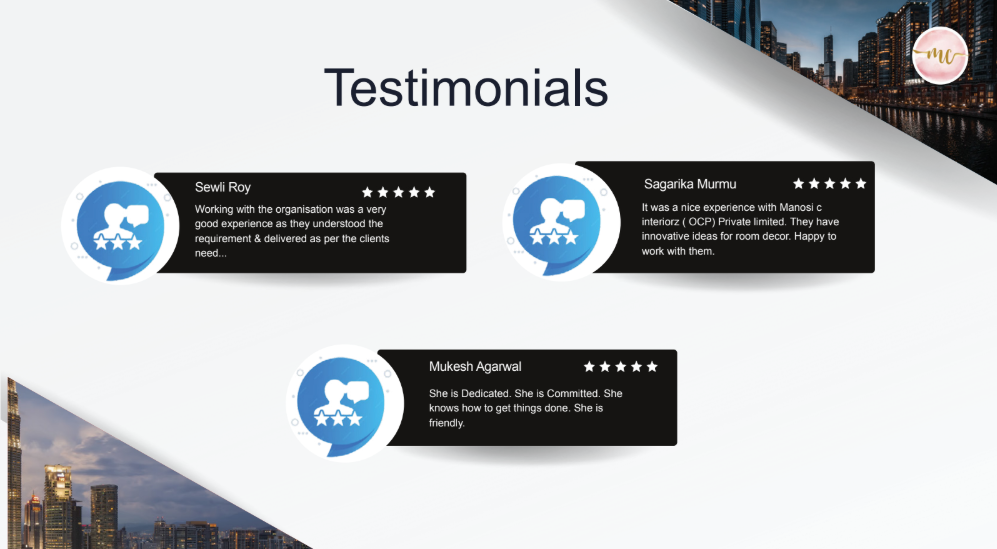 At Manosi C Interiorz OPC PVT. LTD., we believe that interior design is a collaborative process. We work closely with our clients to understand their needs and preferences, and we strive to create spaces that are both beautiful and functional.